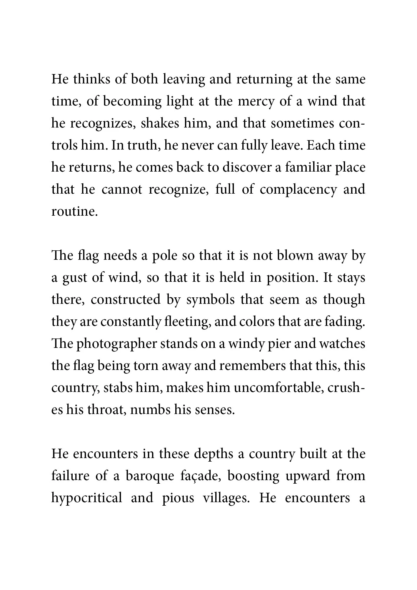 The flag needs a pole so that it is not blown away by a gust of wind, so that it is held in position. It stays there, constructed by symbols that seem as though they are constantly fleeting, and colors that are fading. The photographer stands on a windy pier and watches the flag being torn away and remembers that this, this country, stabs him, makes him uncomfortable, crushes his throat, numbs his senses.